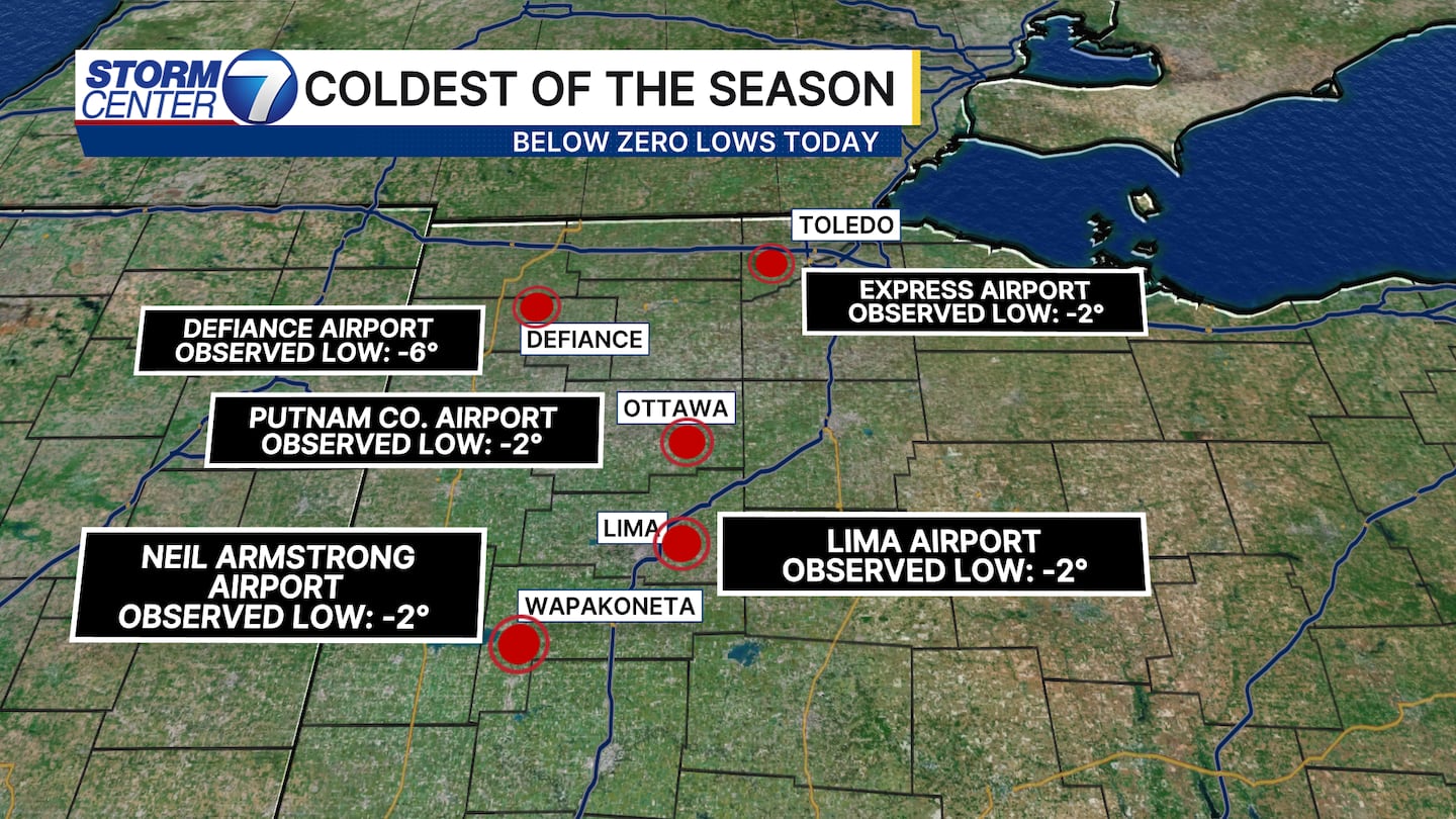 Auglaize County was not the only spot in Ohio to drop below zero this morning! I did some searching around the Buckeye State and found that Defiance, Lima, Toledo, and Ottawa all had a low below zero this morning. Defiance was the coldest at -6 degrees, while Lima, Ottawa, Toledo, and Wapakoneta dropped to -2 degrees! For bragging rights, Wapakoneta was the first station in Ohio to record a sub-zero low.