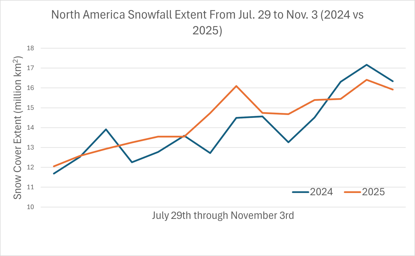 This paints an interesting picture. The orange line is 2025 and the blue is 2024. Notice that most of this year show that 2025, the orange line, had more snow extent than last year, the blue line. However, this year recently we’ve plateaued as compared to a sharp increase in the past month last year. So overall most of this year has had more snowfall extent, just not the past month.